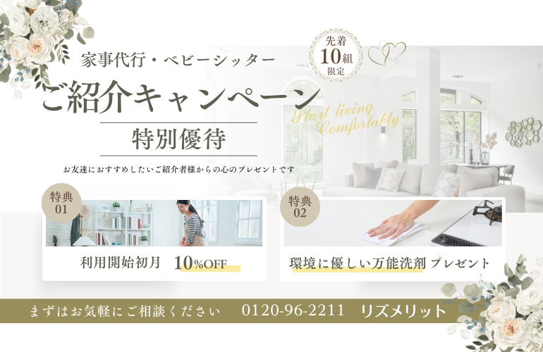 • リズメリットを一度でもご利用いただいたことのある顧客様のご紹介で、リズメリットへの依頼が初めてのお客様への特典です